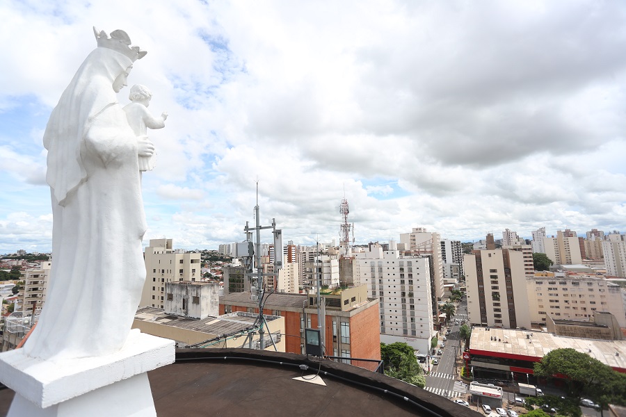 Ela observa o Centro de ponto privilegiado: o alto do edifício Calil Buchala, o popular Marmitão. A imagem de Nossa Senhora do Carmo está há 25